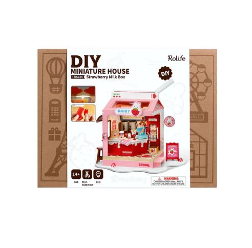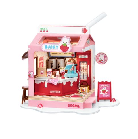 Introducing a delightful DIY miniature milk shop, cleverly designed to resemble a classic milk carton! The shop's structure mimics the familiar carton shape, complete with a playful straw sticking out from the top, bringing a touch of nostalgia to the scene. Inside, you'll find charming details like shelves lined with milk bottles, a small counter, and playful dairy-themed décor. The carton-shaped structure adds a unique twist, turning the shop itself into a whimsical piece of packaging.